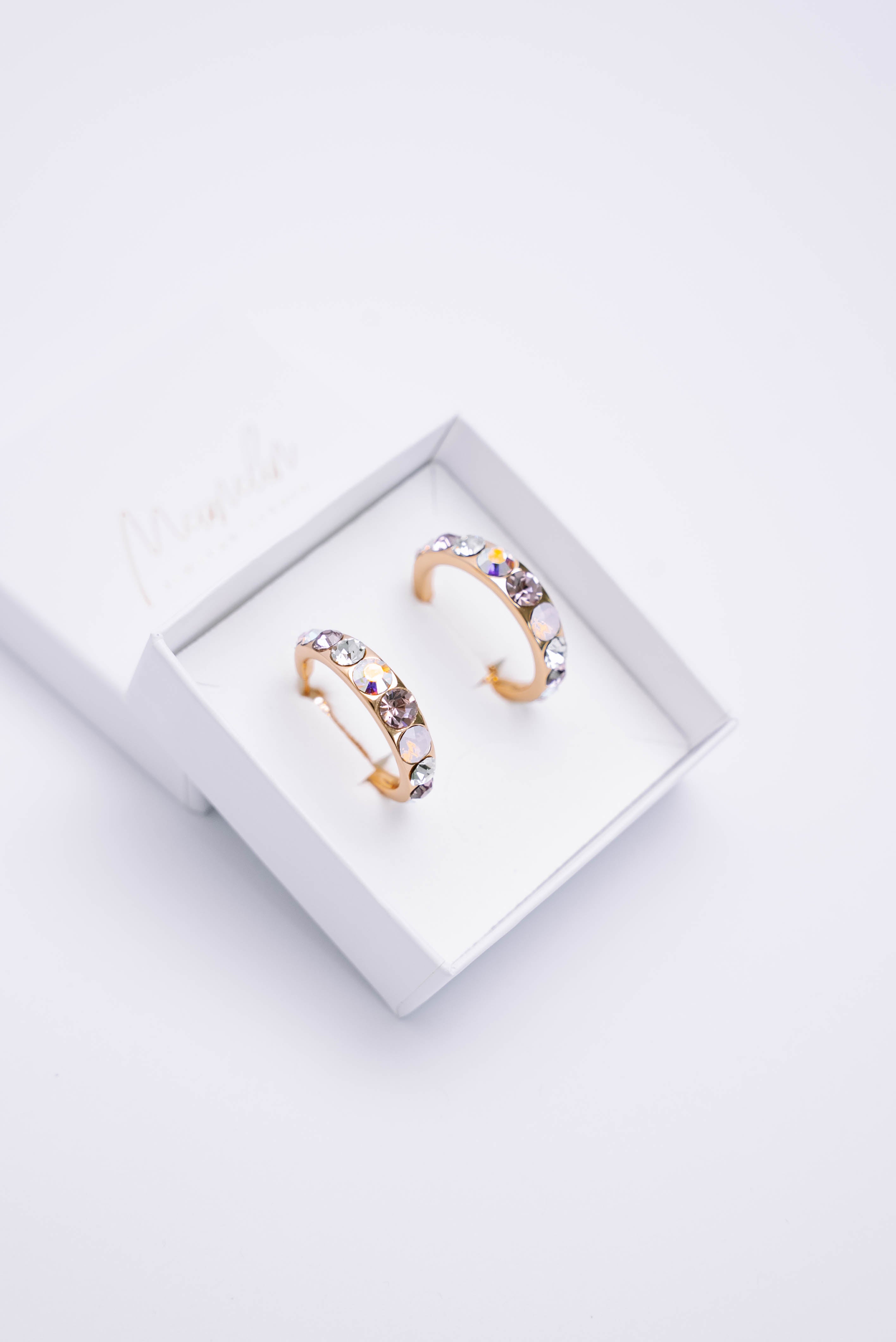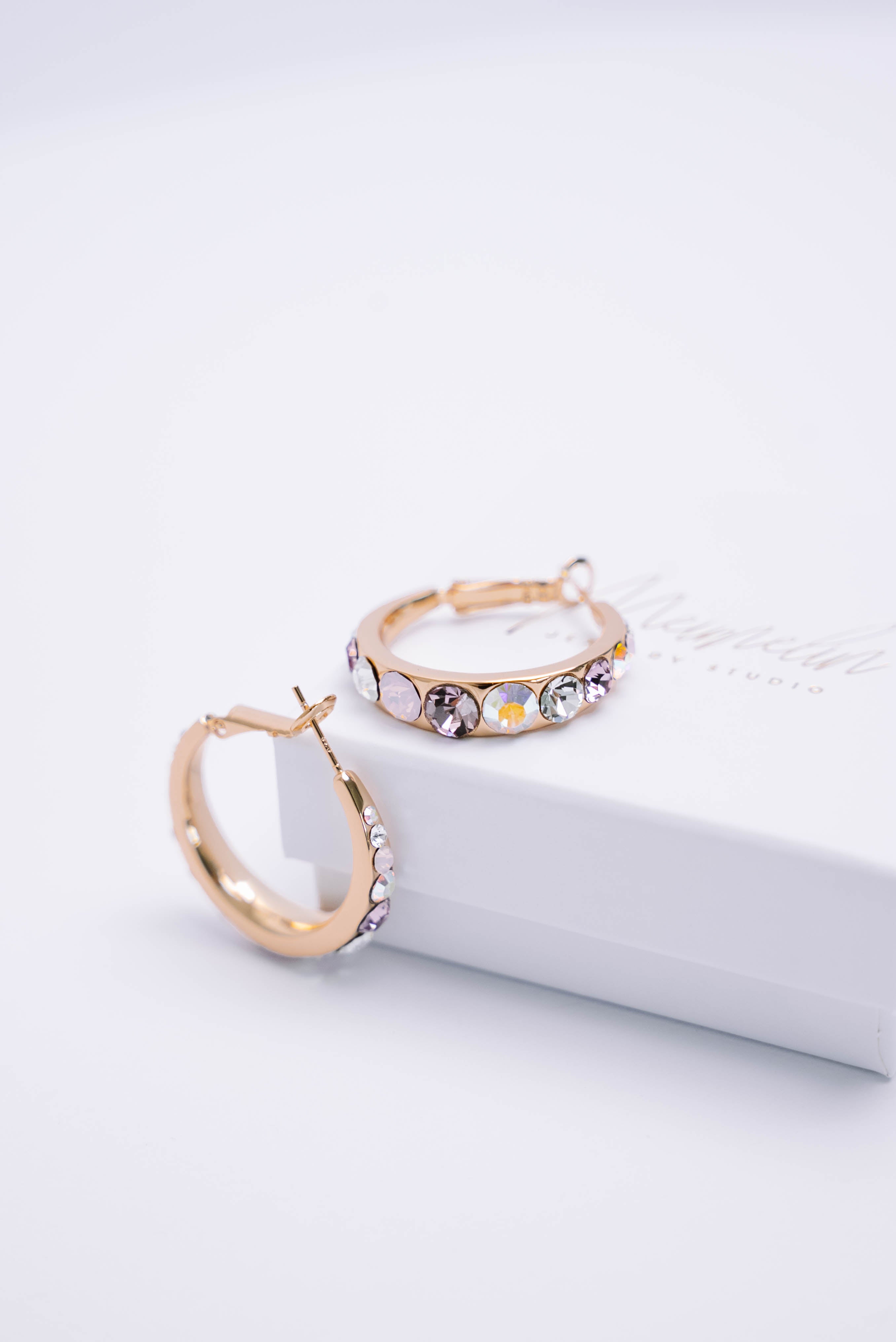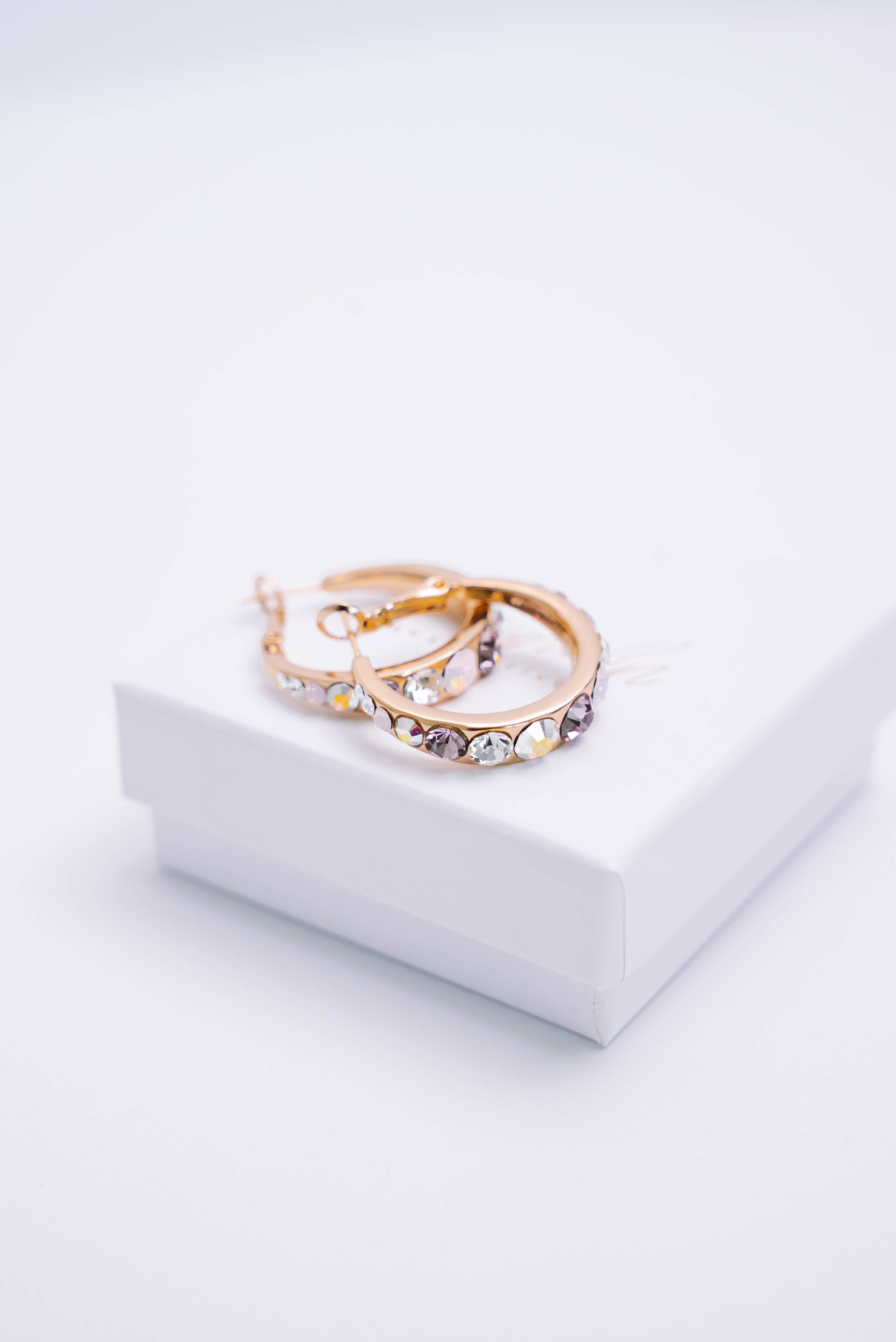 Izteiksmīgi rozā zelta toņa riņķi, pārklāti ar kristāliem papildus mirdzumam.