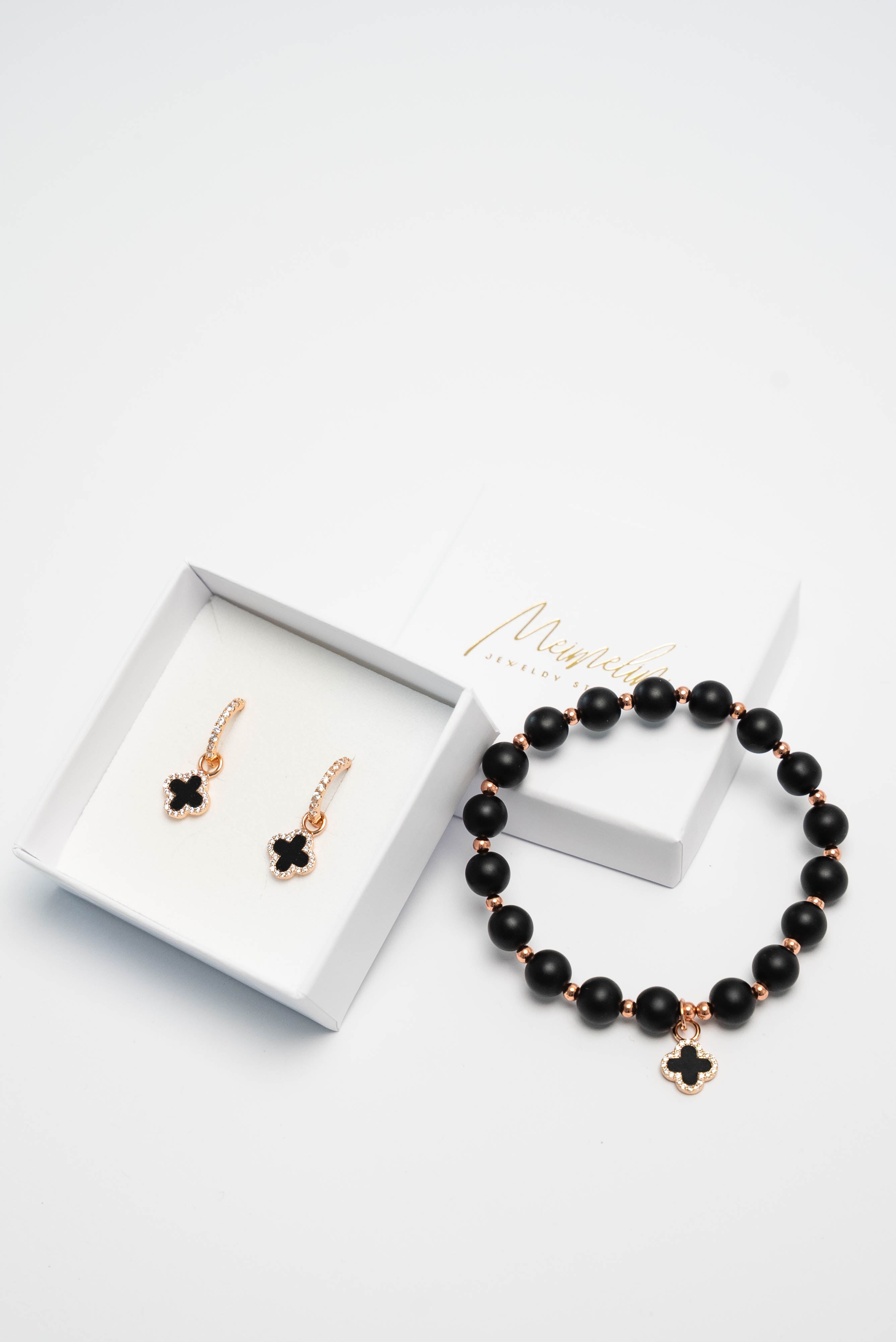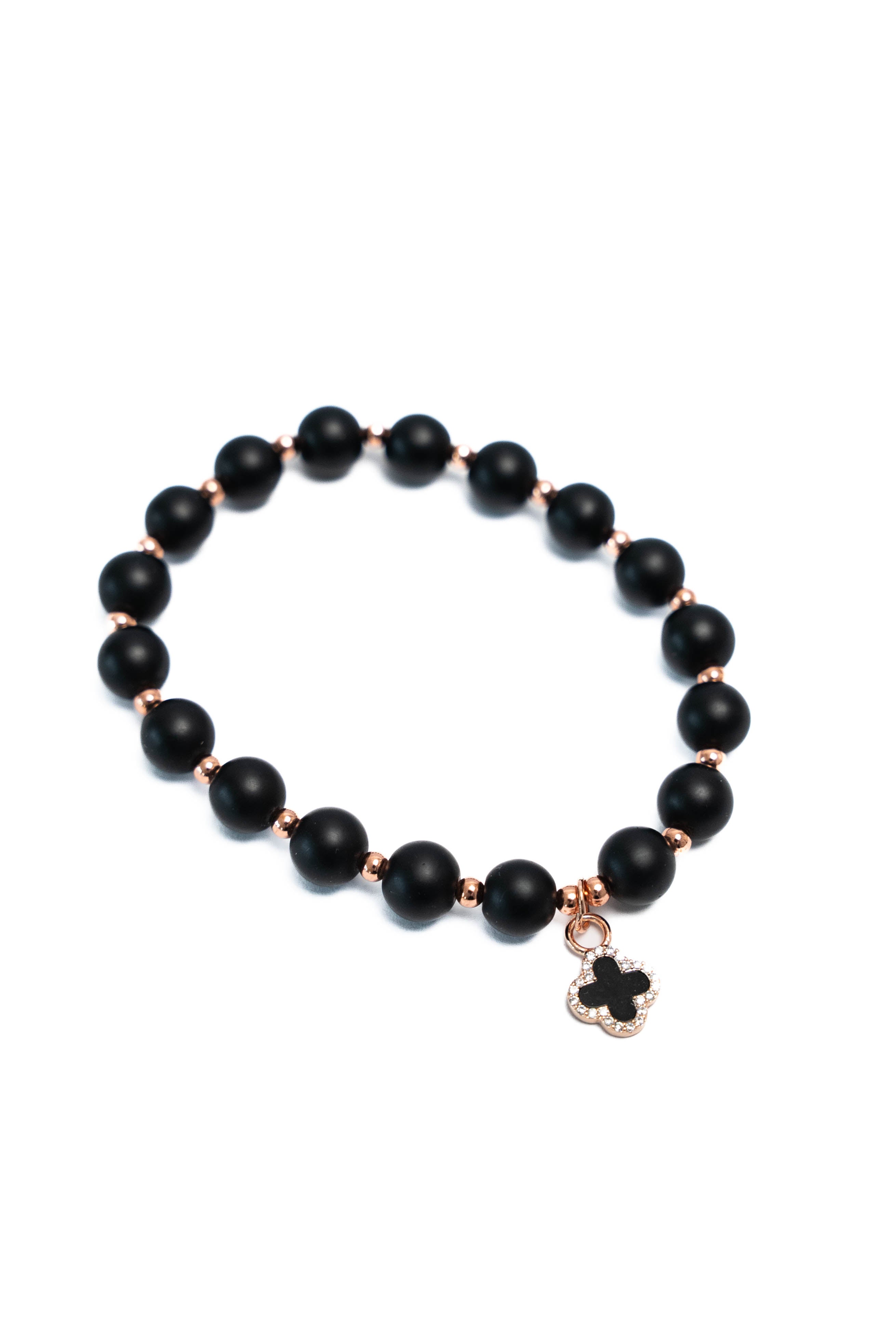 Pusdārgakmeņu aproce gatavota no oniksa ar Clover mirdzošo cirkoniju kuloniņu. Izgatavota uz elastīgas gumijas, kas ērti pielāgojas rokas apkārtmēram.