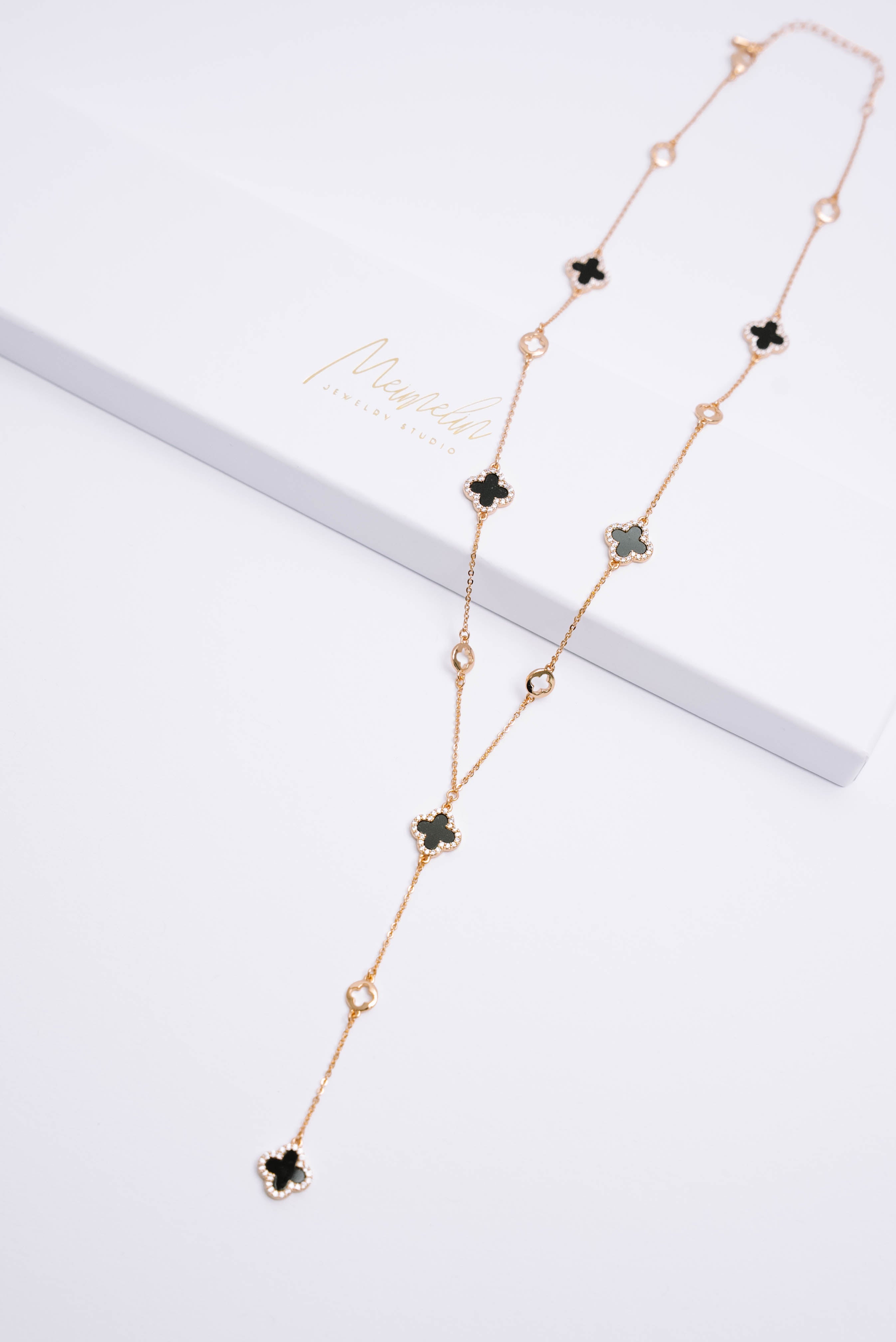 CLOVER Rozā zelta T-veida kaklarota ar melniem Clover kuloniņiem, kas rotāti ar cirkonijiem.