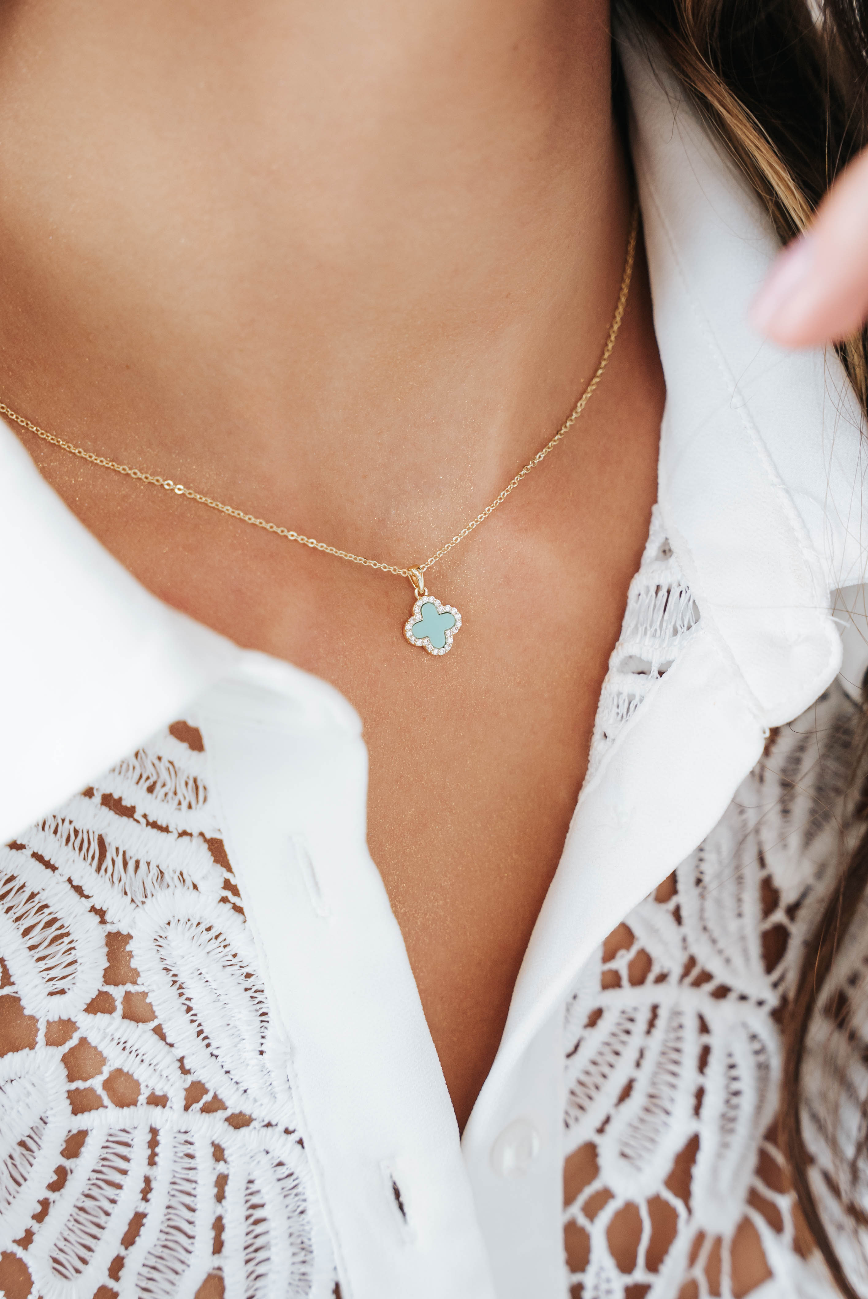 CLOVER Gold kaklarota ar Mint Clover kuloniņu, kas rotāta ar cirkonijiem.