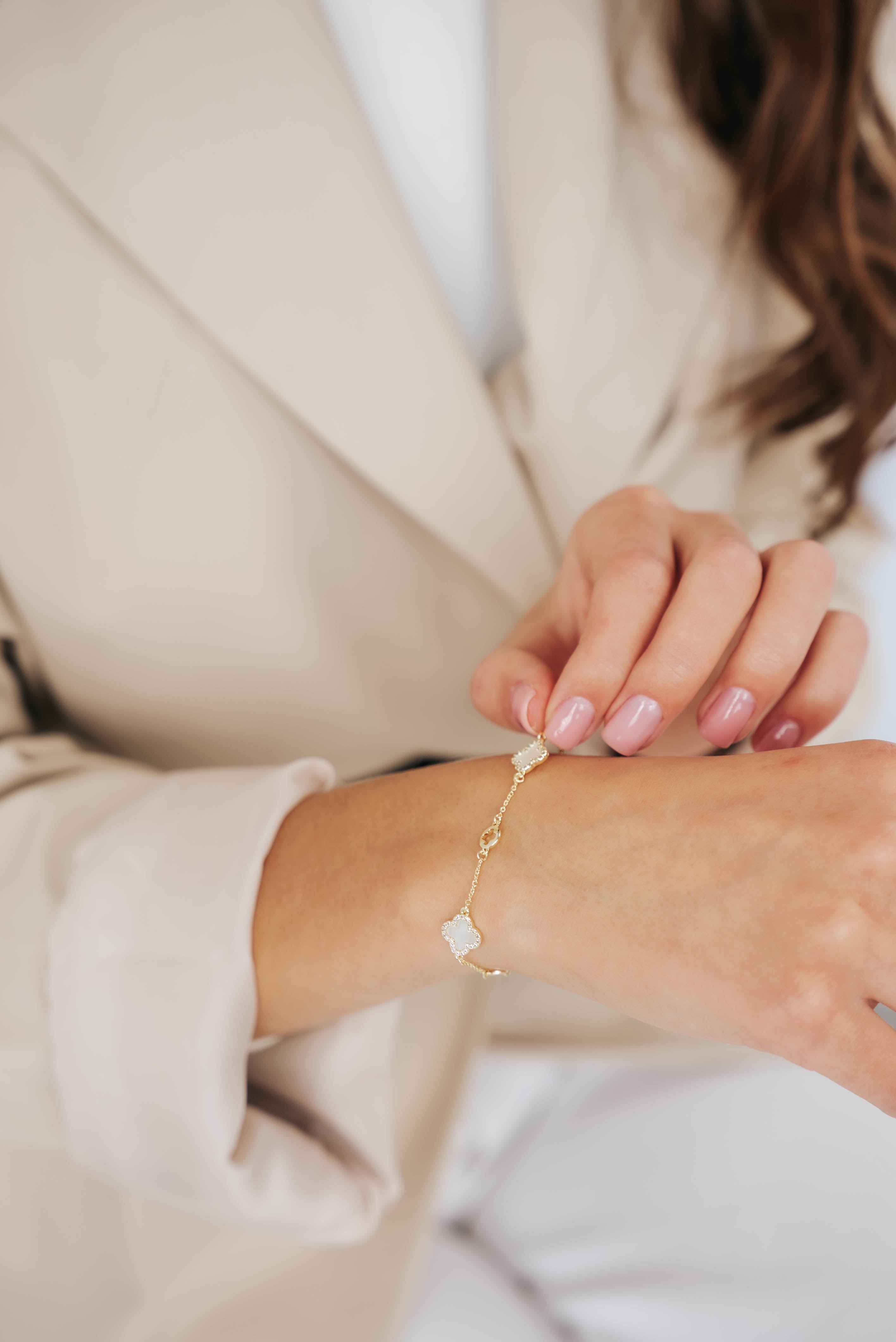 Zelta toņa aproce ar perlamutra baltiem Clover dizaina elementiem.