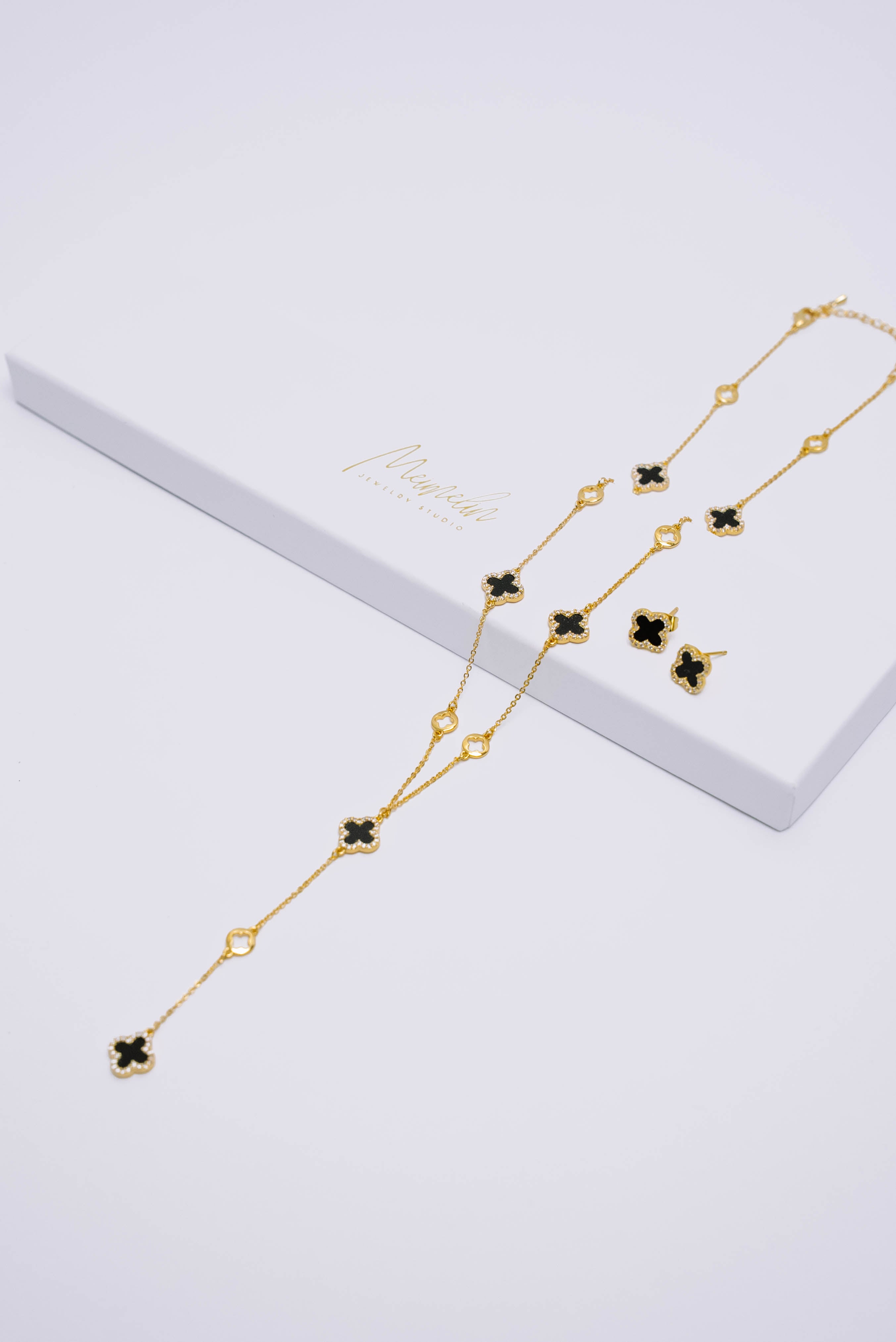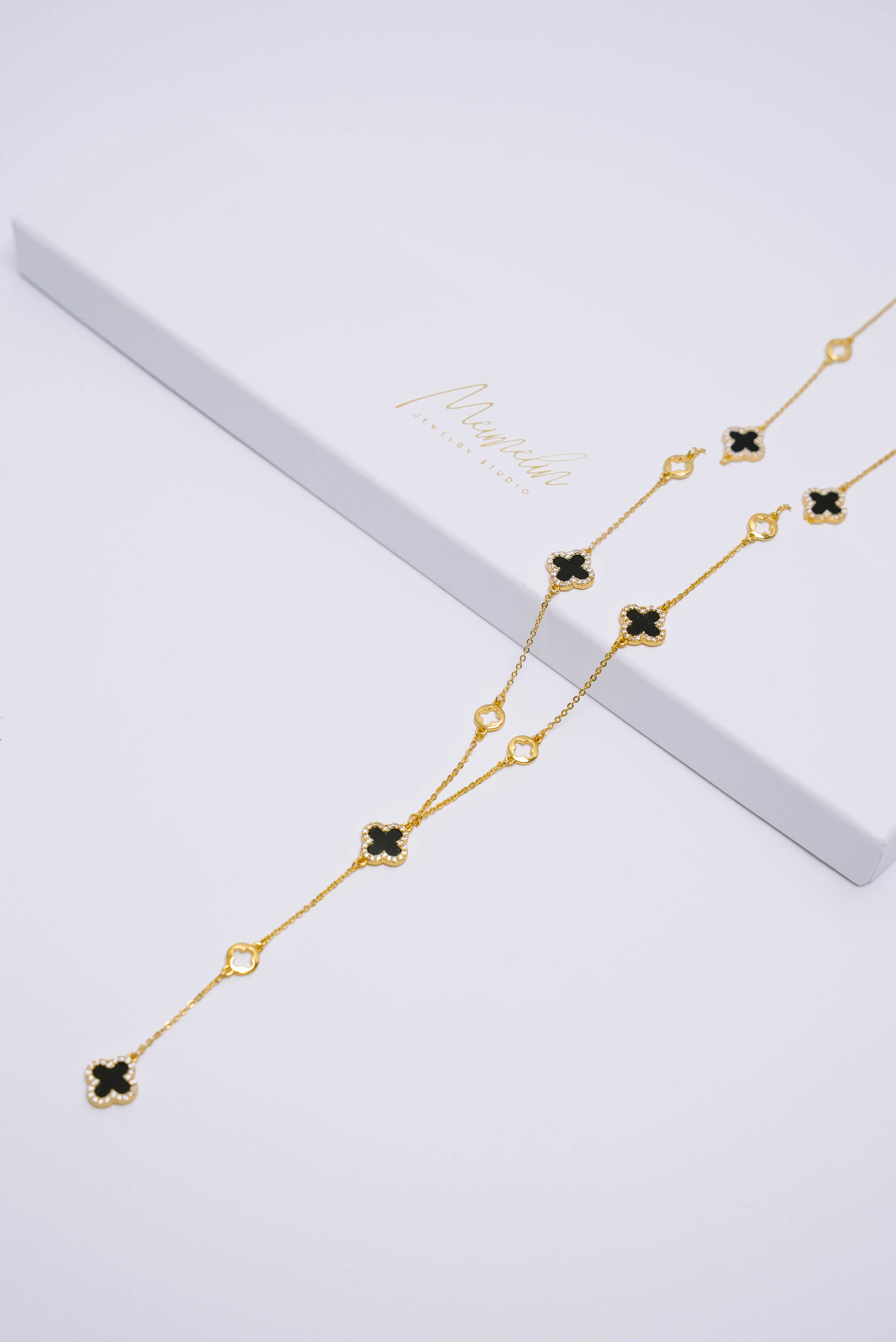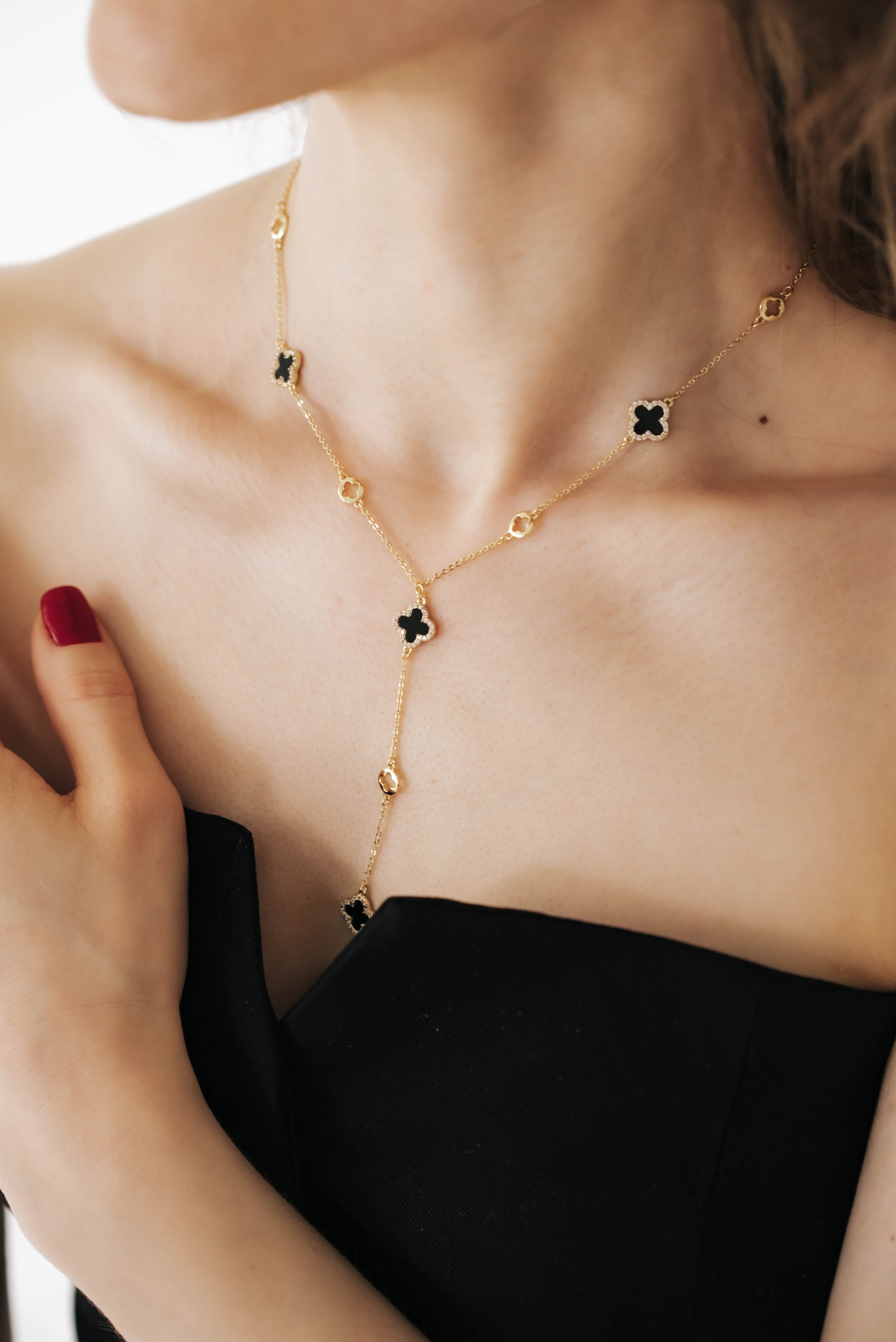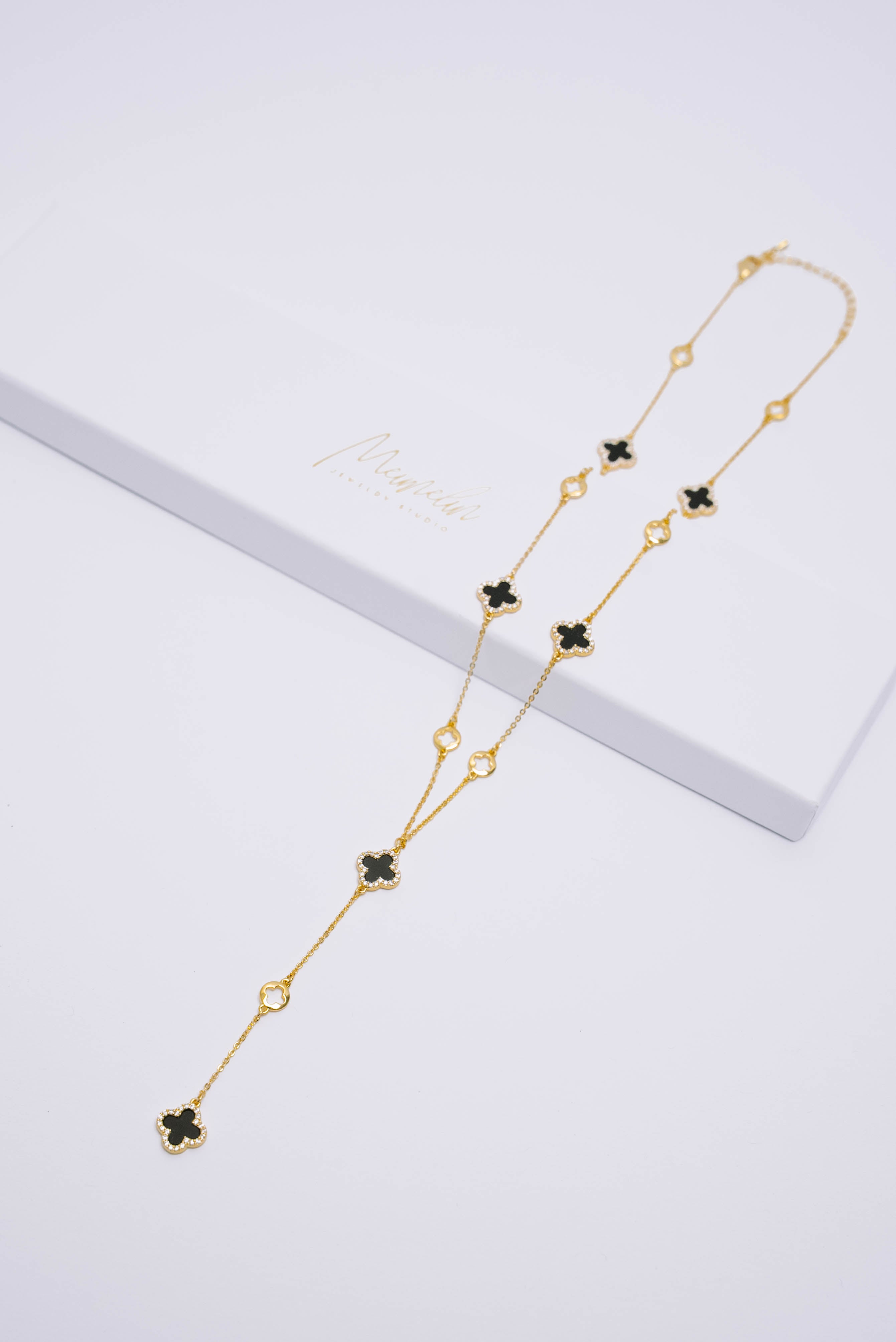 CLOVER Zelta T-veida kaklarota ar melniem Clover kuloniņiem, kas rotāti ar cirkonijiem.
