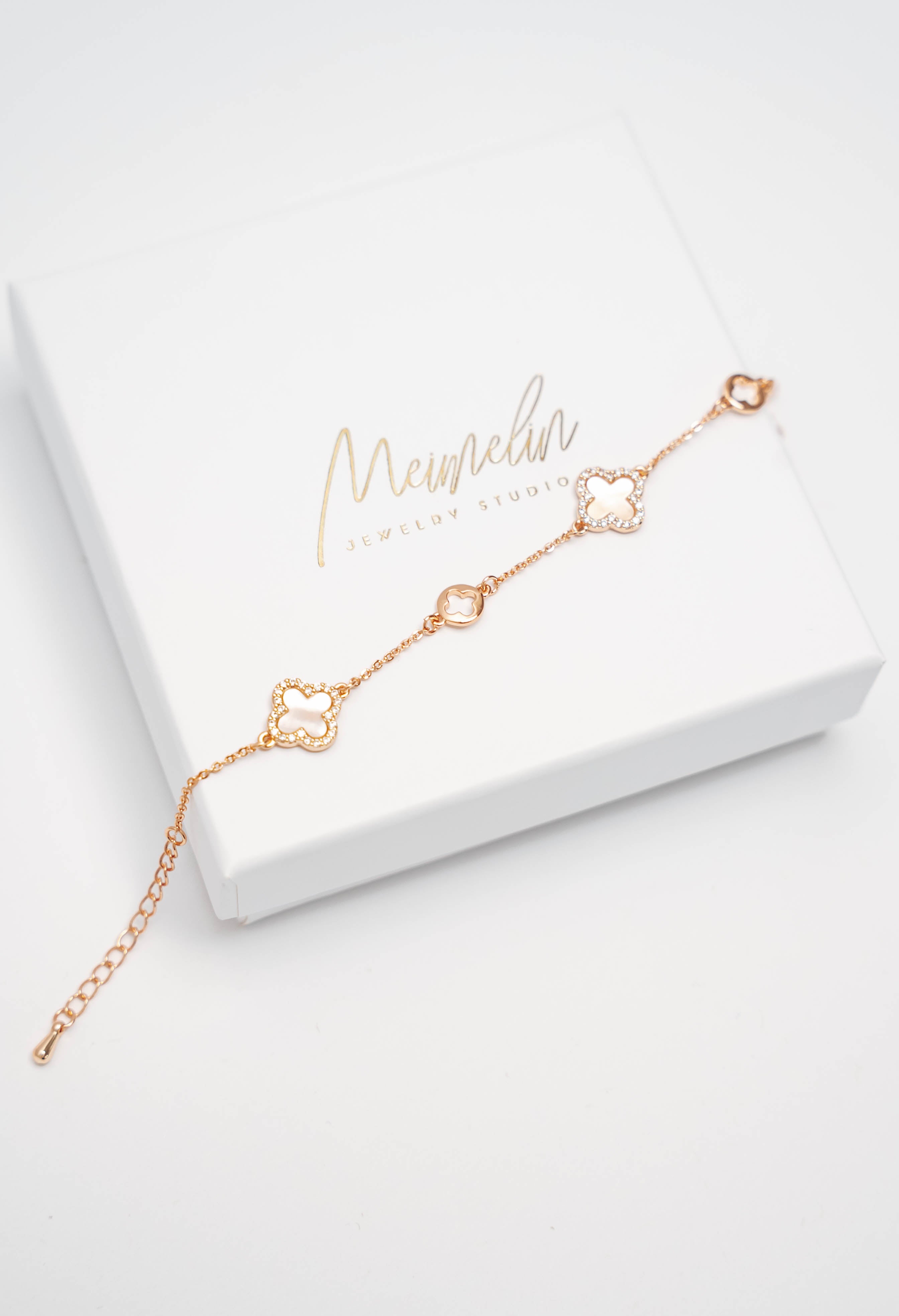 Rose gold toņa aproce ar baltiem Clover dizaina elementiem.