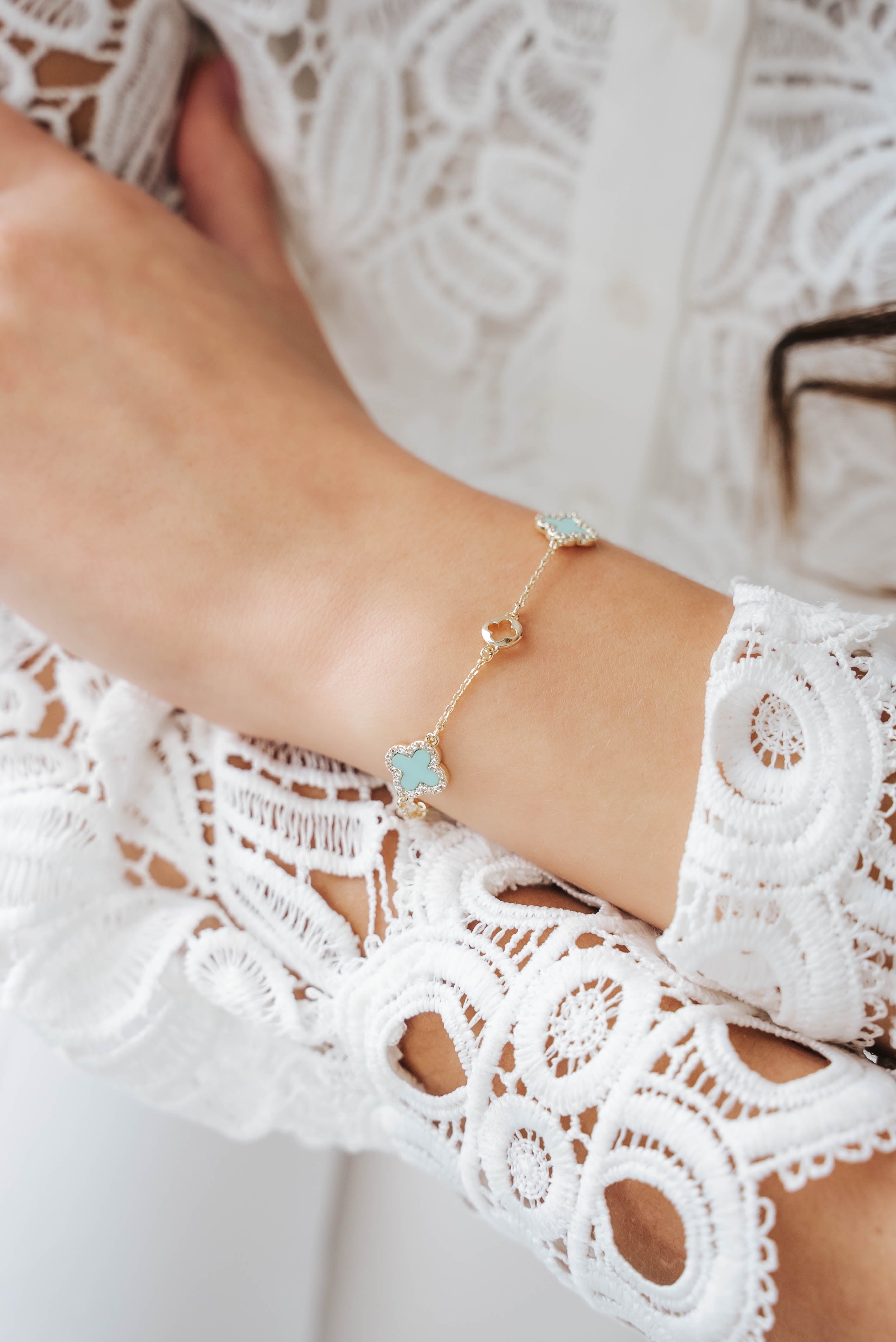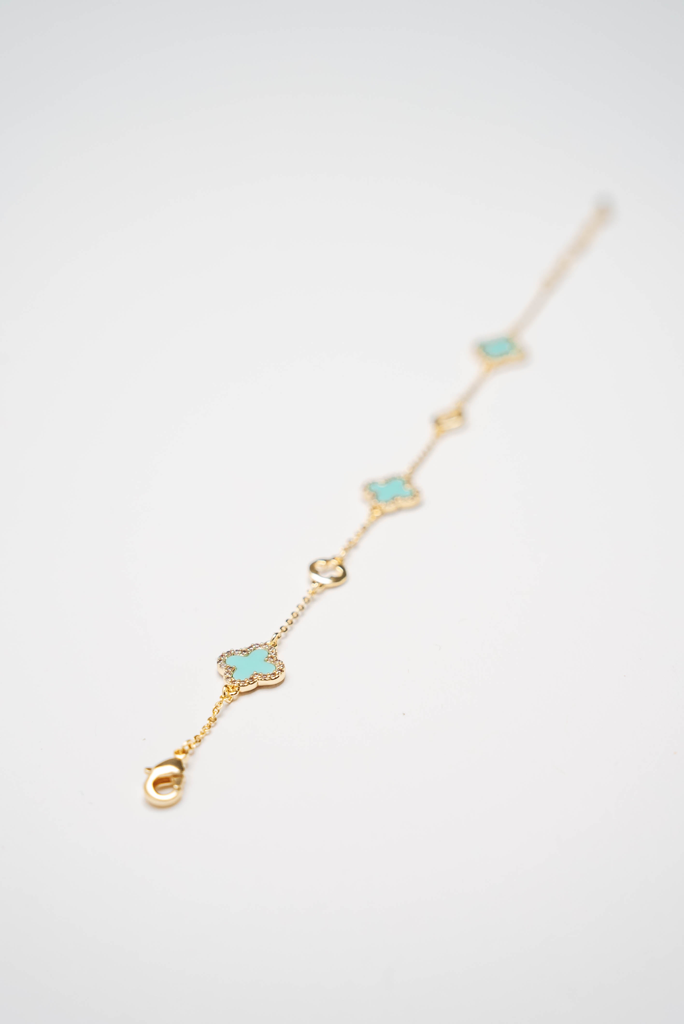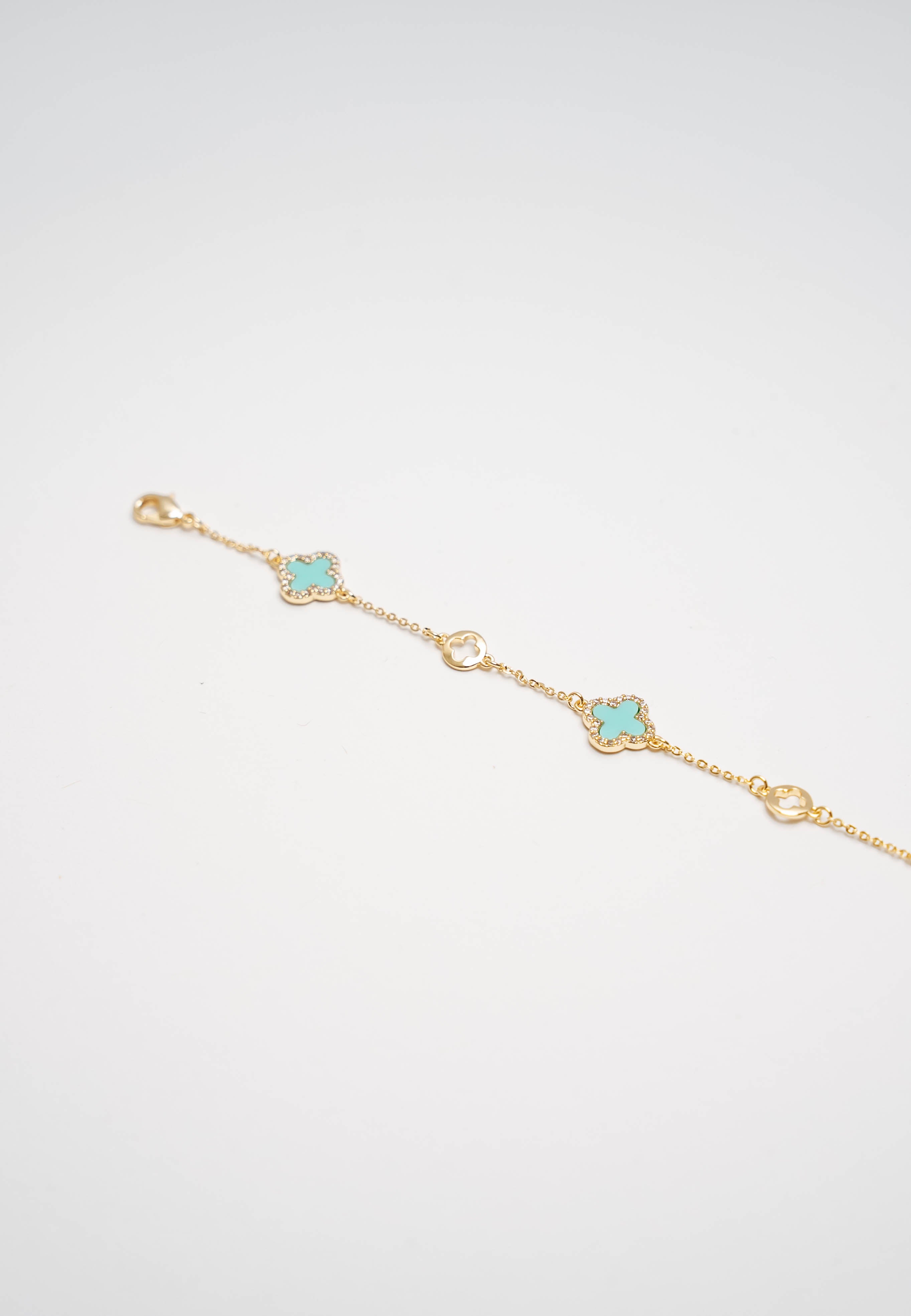 Zelta toņa aproce ar Mint krāsas Clover dizaina elementiem.
