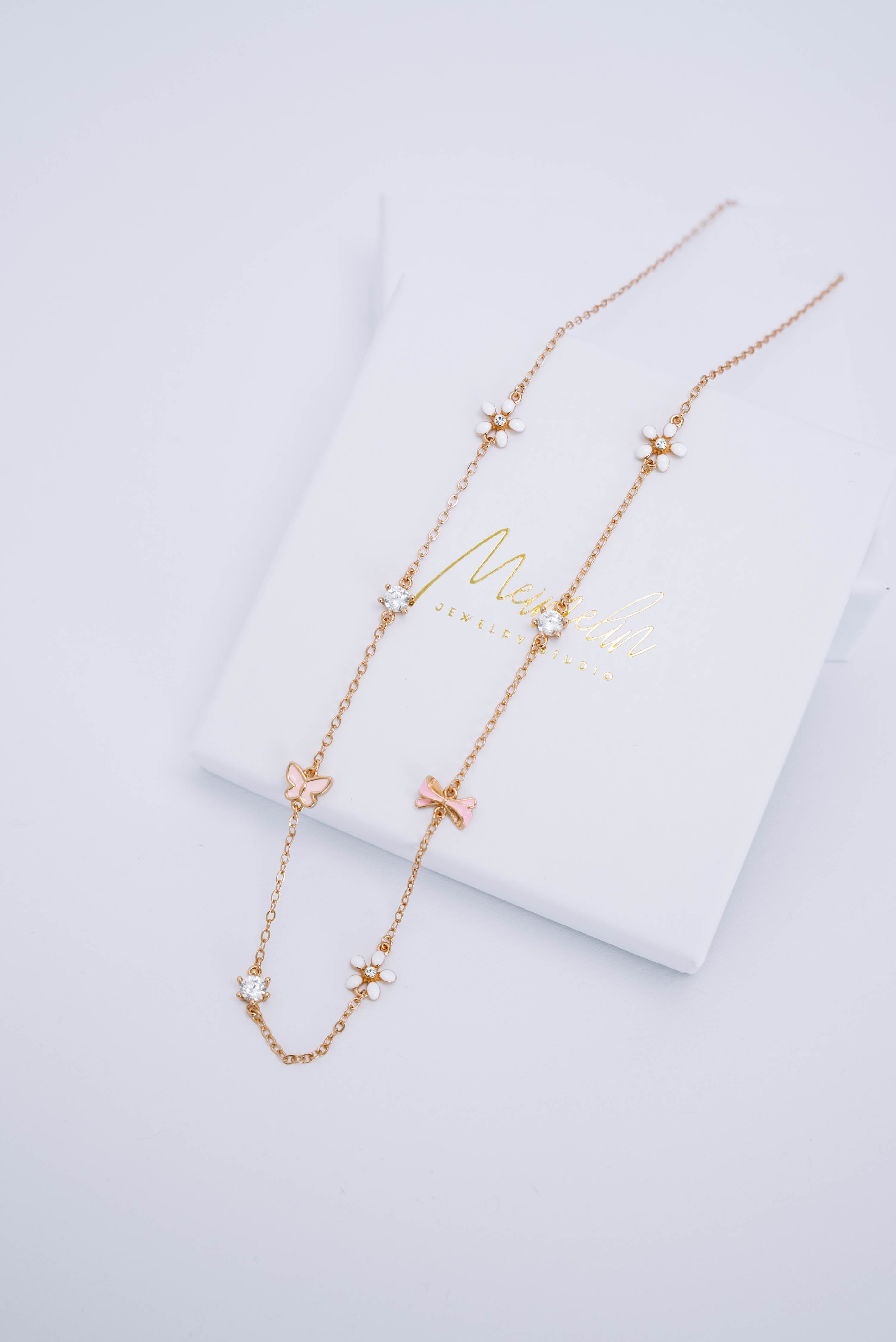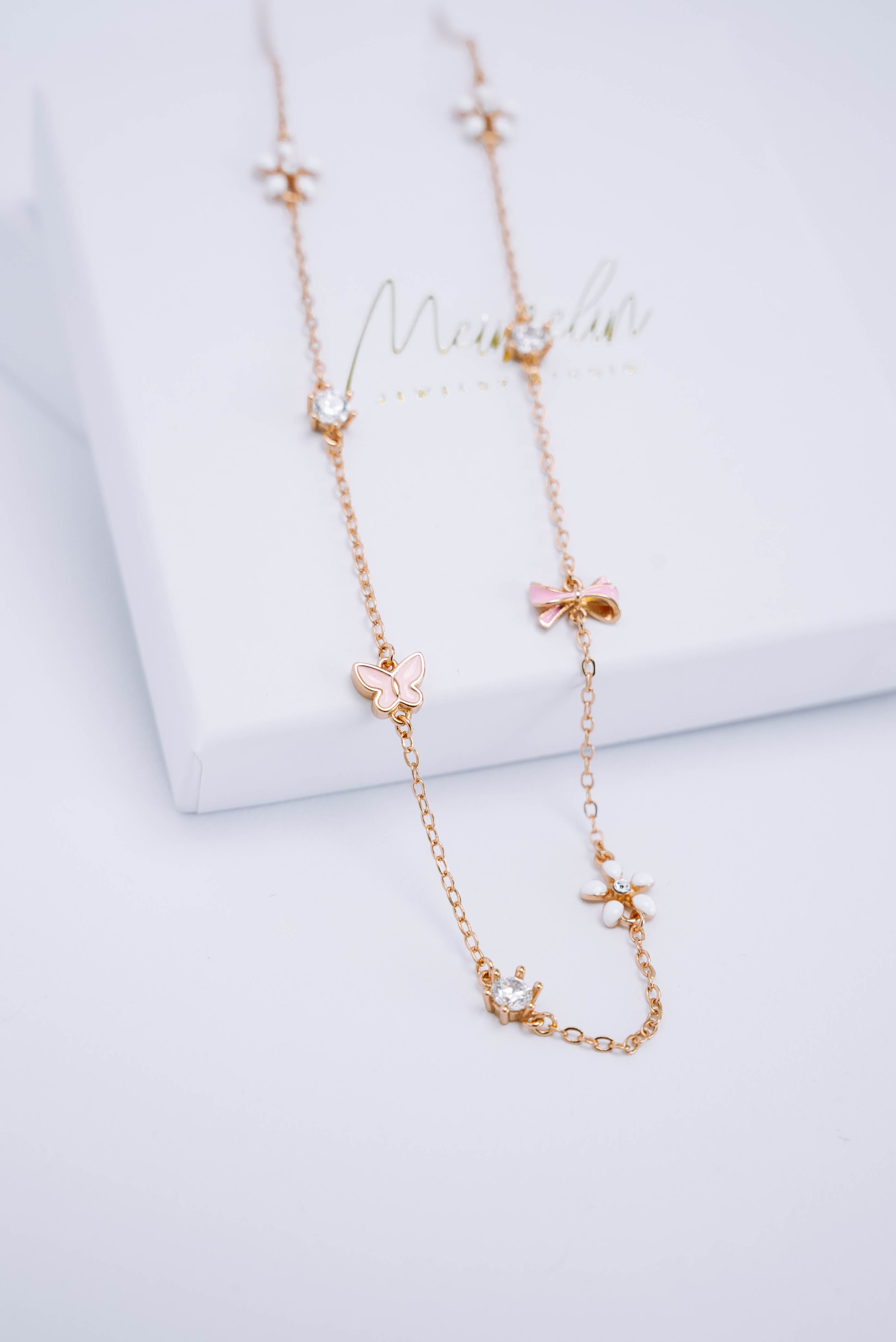 Smalka ķēdīte ar pavasarīgiem elementiem un kristāliņiem.