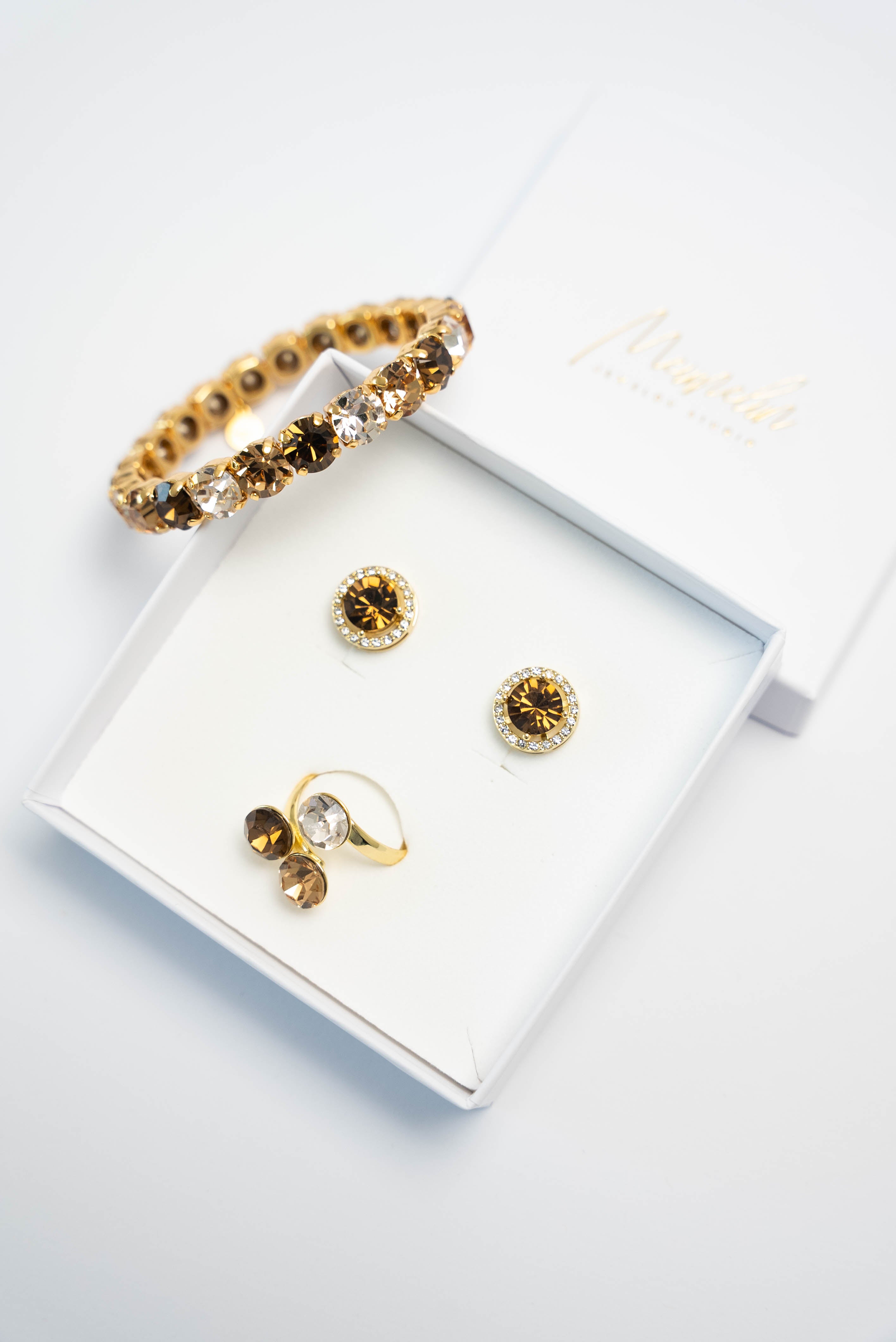 Aproce ir izgatavota no mirdzošas rudens toņu kristālu kombinācijas. Tā izskatās grezna un eleganta.